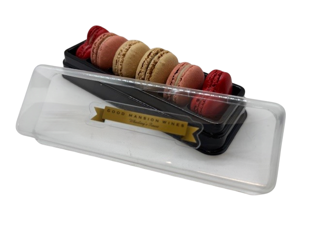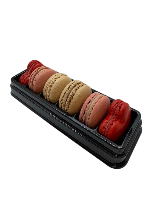 An assortment of raspberry, heart-shaped strawberry, rose lychee and vanilla macarons, in either a 6 or 12 piece box.
